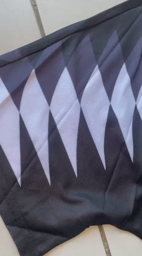• Estampado gráfico con patrón geométrico en blanco y gris que atraviesa los hombros, dándole un estilo único e irreverente.